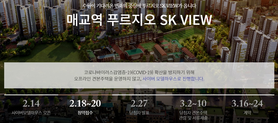 인터넷 청약은 올해 2월3일부터 ‘청약홈’에서 가능합니다. ‘아파트투유’에서 하지 않습니다. 청약홈 사이트는 스마트폰 앱(구글플레이스토어에서 ‘청약홈’검색)에서 설치 가능합니다. 개인별 청약하고자 하는 순위 및 조건을 잘 학인하셔서 가점, 당첨 확률이 높은 분야에 본인이 해당하는지 잘 인지하시고 청약하시면 좋을 것입니다. 세부 입주자 모집공고는 매교 푸르지오 홈페이지에 들어가시면 분양개요 메뉴에서 공급안내 메뉴를 들어가시면, 공고요약, 공고전문, 분양안내문, 청약안내문이 PDF파일로 준비가 되어 있습니다. 게다가 입지환경이나 단지정보를 보시면 조감도도 눈에 그릴 수 있고, 이미지를 보면서 좋은 생각과 꿈을 가지게 되면 청약당첨의 기회에 더 가까이 다가갈 수 있을 것 같은 느낌이 듭니다. 수원 구도심의 재개발로 생활인프라도 누리고 편리한 교통도 누릴 수 있는 매교 푸르지오 SK뷰에 청약당첨이라는 좋은 결과가 나오기를 기대합니다. 공급규모는 3,603세대 중 일반공급 1,795세대로서, 지하2층, 지상20층이며 총52개동입니다. 이번에 여기저기 관심과 소문들이 무성하니 많습니다. 너도나도 조건만 충족하면 청약을 넣을 것 같습니다. 그래서 청약경쟁율이 엄청나게 높이 나올 것 같습니다. 화서파크푸르지오때도 분양가가 당시에는 높다고 했는데, 지금은 프리미엄이 많이 올랐습니다. 매교역부근도 분양가 대비 나중에 입주시에는 많이 오를 것같습니다. 그래서 수원에서도 로또청약이라는 말이 들리고 있습니다. 입지도 구도심이라 생활인프라가 이미 다 갖춰져 있습니다. 바로 입주만 하면 생활 편의를 즐길 수 있으니 분양을 받으면 자산이 올라감에는 분명할 것 같습니다. 초중고도 갖춰져 있고, 무엇보다 분당선 역세권에 수원으로도 매교역과 수원역사이가 지하철로 3분거리 밖에 안되니 출퇴근 등 대중교통이용에 유리할 것 같습니다. 아울러, 수원역 애경타운에서 쇼핑과문화를 즐길 수 있고, 수원시청역쪽으로도 대형마트와 젊음을 느낄 수 있는 곳으로 접근성이 좋아서 청약당첨을 기대해봅니다. 여기저기서 궁금해서 물어보시는 분들도 많고, 반대로 저도 많이 물어보고 있습니다. 지인들도 여기 지역에 관심을 갖고 청약을 넣어본다고 하니, 기대감이 큰 것 같습니다. 구도심이라 생활환경이 잘 갖추어져 있어서 입주후 바로 도심성 생활을 할 수 있으니 좋을 것 같습니다. 주변에 하천이 있는데, 큰 공원만큼은 아니지만 산책정도는 즐길 수 있을 것 같습니다. 여기 매교역 재개발 덕분에 주변에 있는 아파트들도 조금 가격상승을 보이고 있는 것 같은데요, 워낙 구역이 넓고 크다 보니 아파트들이 들어서면 대규모단지 영향이 긍정적으로 작용할 것 같습니다.