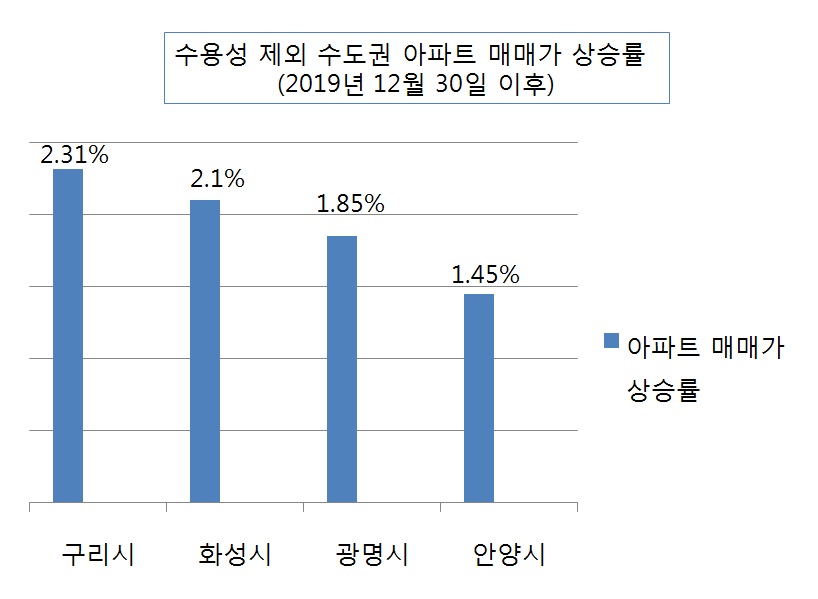 12.16대책 이후 풍선효과가 수도권에서 뚜렷하게 나타나고 있습니다. 부동산 열기가 수용성에서 구리, 광명, 화성을 넘어 시흥, 안양, 의왕, 남양주까지 번지고 있습니다. 2019년 12월30일이후 현재까지 아파트 매매가격 상승률을 살펴보면, 구리시가 2.31%로 가장 높았습니다. 다음으로 화성시 2.10%, 광명시 1.85%, 안양시 1.45%, 의왕시 0.97%, 남양주시 0.75%였습니다. 같은 기간 서울의 아파트 매매가격 상승률은 0.20%였습니다. 특히 구리, 광명 등 수도권 지역의 부동산 가격 흐름은 최근 가파르게 오른 수용성에 못지 않습니다. 같은 기간 수용성은 5~7%대 상승률을 기록했습니다.