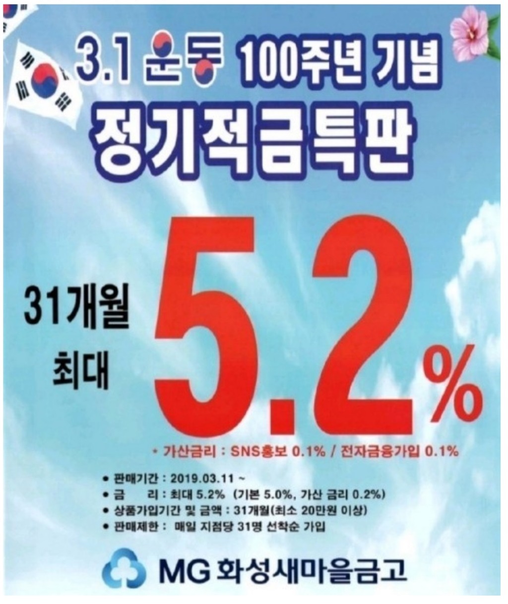 오늘은 2019년 MG화성새마을금고에서 나왔던 고금리 적금 이야기를 해볼까 합니다. 벌써 1년전 이야기가 되어가고 있습니다. 아시는 분들도 있고, 모르셨던 분들도 있으실 겁니다만, 2019년 3월에 엄청 인기를 끌었던 고금리적금 상품이 있었습니다.