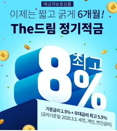 2월에 하나은행이 5퍼센트 고금리 적금 상품을 판매하면서 은행 서버가 다운되고, 은행창구에 사람들이 몰렸던 것이 기억납니다. 이번에는 우리종합금융에서 일명 THE 드림 정기적금을 8월까지 5만좌에 한해서 판매를 한다고 합니다.