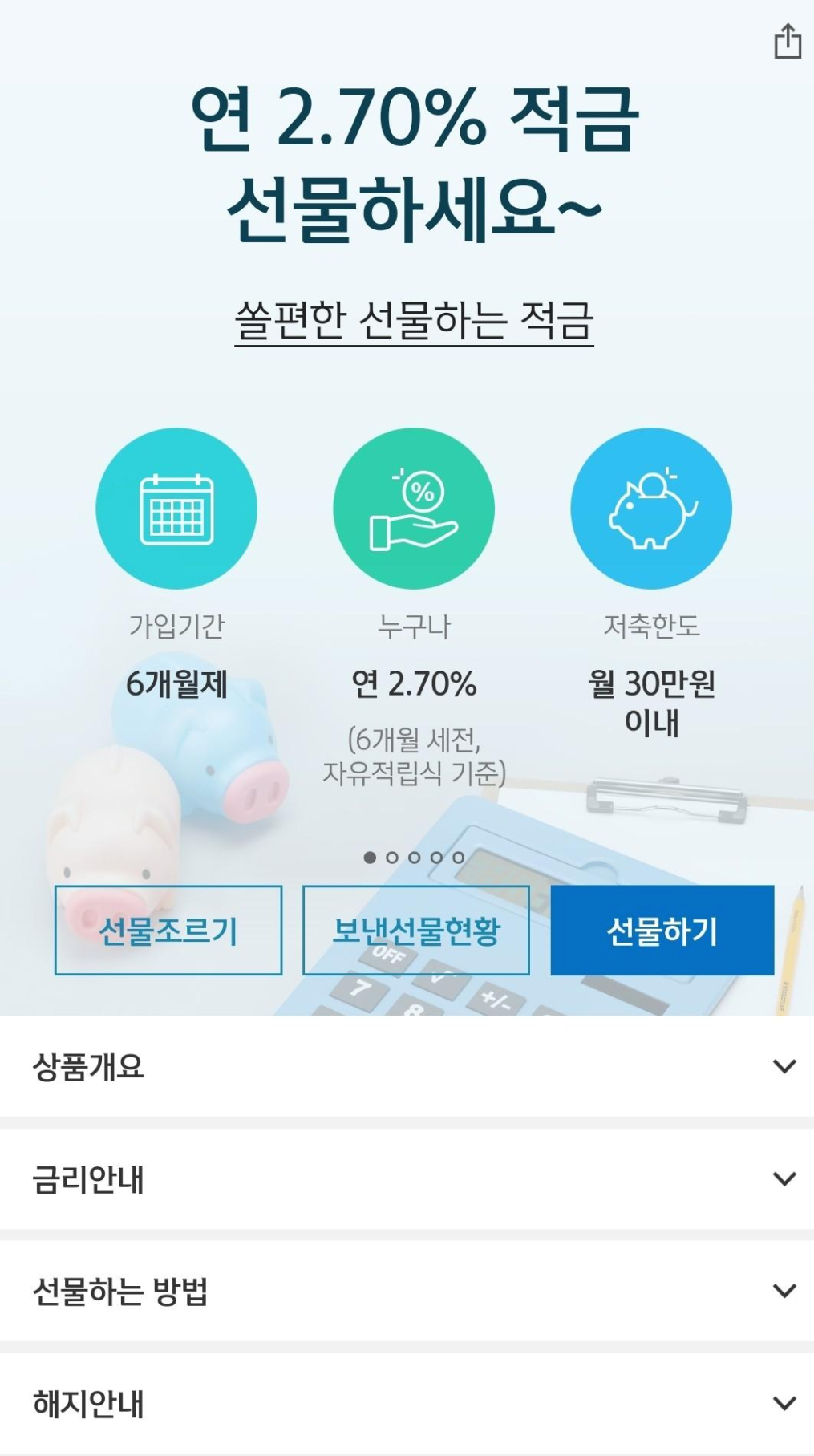 그래도 1퍼센트 금리 대에 2.7퍼센트가 어디냐며 가입을 했습니다. 어제는 한국은행이 금리를 0.5퍼센트 내려서 우리나라 경제사상 처음으로 0퍼센트대 금리를 보게 되었다고 합니다. 이런 마당에 6개월이라는 짧은 기간이긴 하지만 2.7퍼센트 금리라도 받아 볼까 하고 가입했습니다. 가입방법은 기존 신한은행 고객이면 가입하기 수월할 것 같습니다. 우선 쏠 어플을 설치합니다. 저는 구글 플레이스토어에서 설치했습니다. 저는 신한은행 계좌는 있었지만, 쏠 어플은 없었습니다. 그래서 이번에 플레이스토어에서 다운받아 설치했습니다. 기존 고객이었던 덕분에 자동으로 계좌가 생성이 되어 있었습니다. 그래서 쏠에 쉽게 가입을 한 후, 상품 검색 메뉴로 들어갔습니다. 상품메뉴에서 각종 예금, 적금 상품이 쭈루룩 나옵니다. 거기서 쏠편한 선물 적금을 선택했습니다. 그런데 문제가 생겼습니다. 저 혼자 가입신청해서 하는게 아니었습니다. 누군가가 선물을 해주면 선물받기를 통해서 가입하는 방식이었습니다. 그래서 선물적금이라는 이름이 들어간 것 같습니다. 누구한테 부탁하나 고민했습니다. 쏠 편한 선물 적금 메뉴중에 선물조르기라는 메뉴가 있었습니다. 그래서 누구한테 조를까 고민하다가 친구에게 카카오톡으로 선물조르기를 보냈습니다. 그러고 나서 이러쿵 저러쿵 설명을 했습니다. 내가 적금하나 가입하려고 하는데 이 상품은 누가 선물을 보내주고, 계좌이체도 해줘야 하는 상품이니까 선물 보내기 좀 해달라고 요청했습니다. 쏠 편한 선물적금은 돈도 계좌 이체 해줘야 하더라구요. 그래서 친구에게 돈도 보내라고 했습니다. 하하하. 친구덕분에 쏠 선물 적금 상품을 선물받기로 받았습니다. 선물받기로 받으면 제 핸드폰 번호를 입력하고, 납입일자 등을 선택하면 친구가 보낸 계좌이체금이 제 계좌로 들어옵니다. 가입기간이 최대 6개월이니까 그냥 6개월 꽉 채웠습니다. 금액은 매월 1,000원부터 30만원까지 가능합니다. 그런데 제가 이번에 늦게 알고 가입하느라 0.3퍼센트 손해 본 것 같아 아쉽습니다. 2월에만 가입했어도 연 3.0%를 적용받았을 것 같아서입니다. 금리가 내려간 것이 3월부터 인 것으로 확인됩니다. 2월까지만 해도 연 3.0%였던 것 같습니다. 신문기사도 그렇고 다른 가입자들 이야기도 그렇고요. 부지런하게 재테크 실천하는 것도 노력이 필요한 것 같습니다.