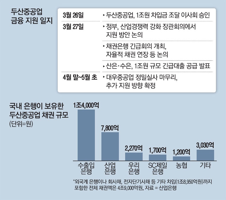 산업은행과 수출입은행은 두산 주식과 부동산을 담보로 대출성 신규 자금 1조원을 투입합니다. 두산중공업은 극심한 자금난에 시달리고 있습니다. 경영 악화에 최근 바이러스성 팬데믹 현상으로 일부 휴업과 명예퇴직 등을 검토하고 있습니다. 산업은행과 수출입은행이 두산중공업에 1조원 규모의 자금을 투입하면서 두산중공업의 대주주인 (주)두산은 주식과 부동산 신탁수익권 등을 담보로 제공하는데, 전체 담보는 대출금인 1조원을 넘는 금액이라고 합니다. 아울러, 이번 신규자금은 두산중공업이 수출입은행에 신청한 6,000억원 규모의 해외공모사채 만기 대출 전환 건과는 별도라고 합니다. 두산중공업은 4월에 만기가 돌아오는 외화채권을 대출로 전환해 달라고 지급 보증을 수출입은행에 요청한 상태이고, 긍정적 입장으로 검토하고 있는 것으로 보입니다. 수출입은행이 두산중공업의 요청에 응하면 외화대출 6,000억원에 대한 만기 부담도 덜게 될 것입니다. 두산중공업은 최근 수주 부진 등으로 40대 이상 직원들에 대해 명예퇴직을 실시하는 등 고강도 구조조정을 단행했지만 만족할 만한 성과를 얻지 못했습니다. 2,600여명 직원 대상으로 실시했으나, 신청자는 600여명에 그친 것으로 알려졌습니다. 두산중공업은 회사가 어려워진 이유로 원자력, 석탄화력 프로젝트 취소로 인한 실적 악화 등을 거론했습니다. 실적이 가장 좋았던 2012년과 비교할 때 매출이 절반 이하로 떨어지는 등 정상적인 영업활동으로는 금융비용을 감당하기 어려웠다고 합니다.