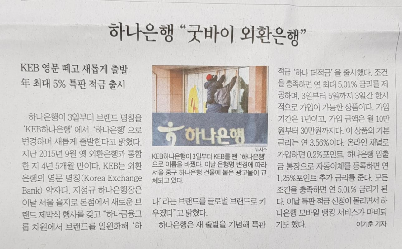 은행의 고객인 저희들에게 무엇보다 좋은 소식은 ‘하나은행’이 새 출발을 기념해서 연 최대 5.01% 금리를 제공하는 특판 적금을 출시했습니다. 저금리 시대에 이런 뉴스는 저희들 눈길을 확 사로 잡을 수밖에 없습니다.