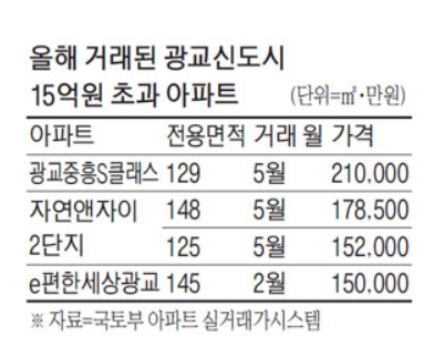 광교신도시에선 이 밖에도 15억원을 초과하는 거래가 여러 건 나왔습니다. `자연앤자이2단지` 전용 125㎡는 지난달 15억2000만원, 전용 148㎡는 17억8500만원에 거래됐고요, `e편한세상광교` 전용 145㎡는 2월 15억원에 거래됐습니다.