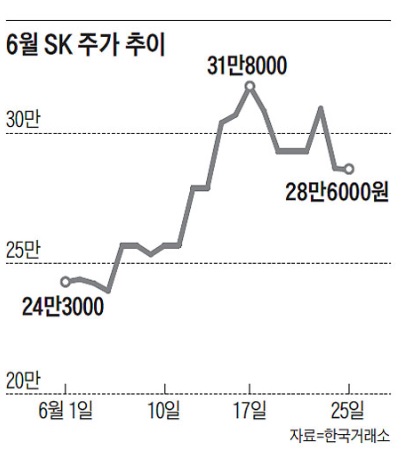 하지만 자회사 청약 흥행으로 고공 행진할 것으로 보이던 SK 주가는 기대와 달리 미끄러지면서 개미들의 가슴을 멍들게 했는데요. 증권업계 관계자는 "지난 24일 KB국민은행이 보유하고 있던 5000억원 상당의 SK 지분 전량을 블록딜(시간 외 대량 매매) 방식으로 외국계 금융회사에 처분하면서 주가 급락을 촉발했다"고 전해지네요. 지난 2011년에 SK 지분을 2000억원에 매입했던 KB국민은행은 '호재에 떠나라'는 증시 격언처럼 주가 상승 기대감이 한껏 고조된 파티 날에 미련 없이 던지면서 3000억원가량의 차익을 챙겼습니다.