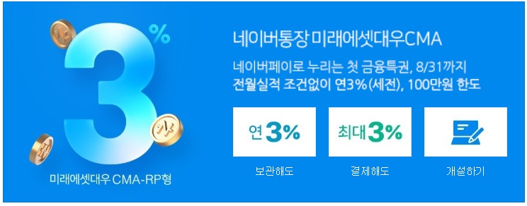 최근 핫한 온라인 통장상품이 ‘네이버통장’입니다. 네이버의 금융 전문 자회사 네이버파이낸셜과 미래에셋대우가 손잡고 내놓은 이 상품은 최고 연 3%의 예치금 수익을 홍보하고 있어요. 네이버 쇼핑·예약 등에서 결제하면 결제액의 최대 3%를 포인트로 적립해 주는 혜택도 있다고 해용.