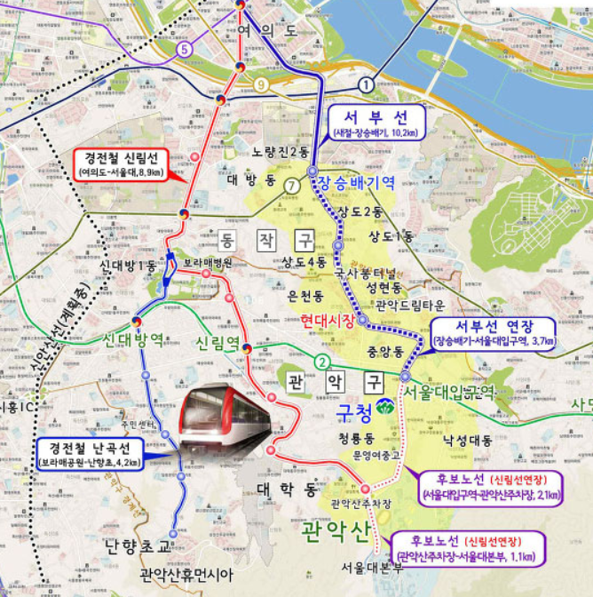 신림선 경전철이 2022년 개통될 예정이라는 점도 거래가 활발해진 이유로 분석되는데요, 신림선 경전철은 지하철 9호선 샛강역에서 대방역-보라매역-신림역-서울대를 연결하는 노선입니다.